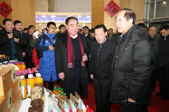 (左)陪同農(nóng)業(yè)部副部長(zhǎng)屈冬玉(中)視察參展產(chǎn)品