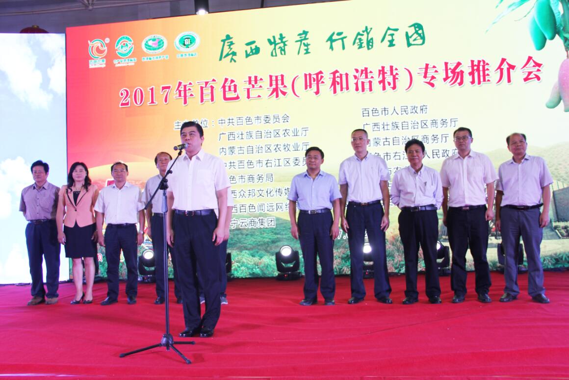 7月27日上午,由中共百色市委員會、百色市人民政府、內蒙古自治區(qū)農牧業(yè)廳、內蒙古自治區(qū)商務廳、廣西壯族自治區(qū)商務廳、廣西壯族自治區(qū)農業(yè)廳主辦的2017年百色芒果專場推介會在協(xié)會會員單位、內蒙古食全食美集團美通食品批發(fā)市場內蒙古農畜產(chǎn)品展銷大廳舉行。百色市委副書記、統(tǒng)戰(zhàn)部部長楊春庭在推介會上宣布活動正式啟動,內蒙古自治區(qū)農牧業(yè)廳副廳長劉永志、百色市政協(xié)副主席韋曉東等領導出席推介會,有關特邀嘉賓、百色市、縣有關部門代表、內蒙古自治區(qū)有關部門、呼和浩特市有關部門負責人、客商代表、新聞媒體等參加會議。