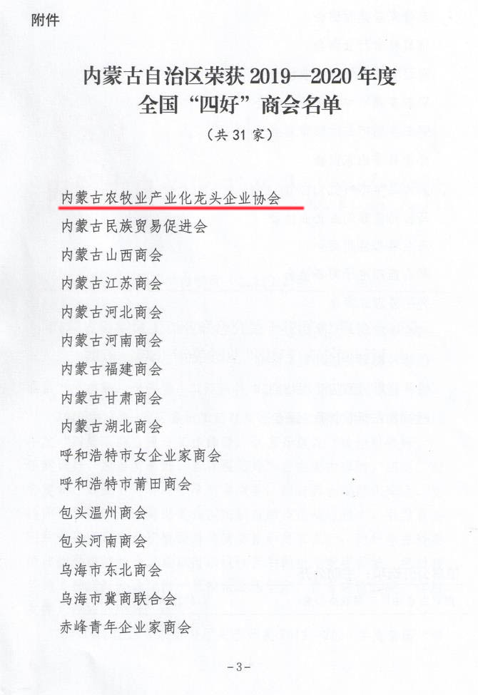 標題:喜報!內(nèi)蒙古農(nóng)牧業(yè)產(chǎn)業(yè)化龍頭企業(yè)協(xié)會榮獲全國“四好”商會榮譽稱號