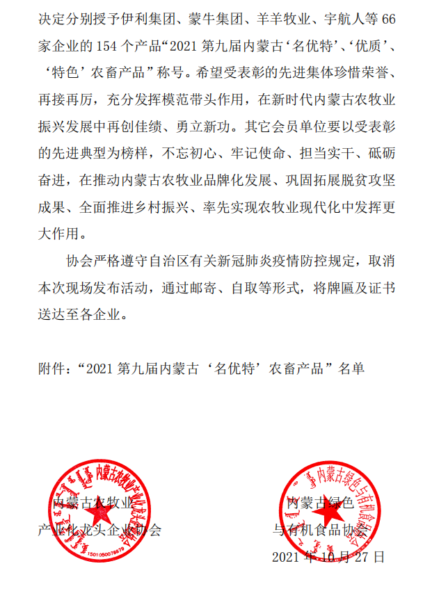 標題:關于表彰獲得 “2021第九屆內(nèi)蒙古‘名優(yōu)特’農(nóng)畜產(chǎn)品”認定企業(yè)的決定