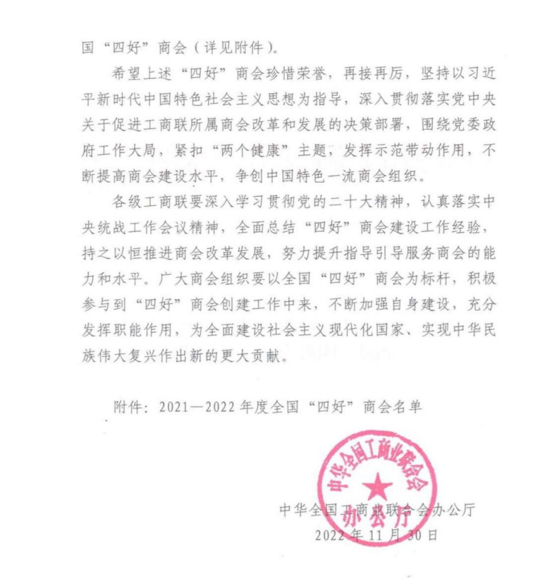 再次榮獲全國(guó)“四好”商會(huì)榮譽(yù)稱(chēng)號(hào)
