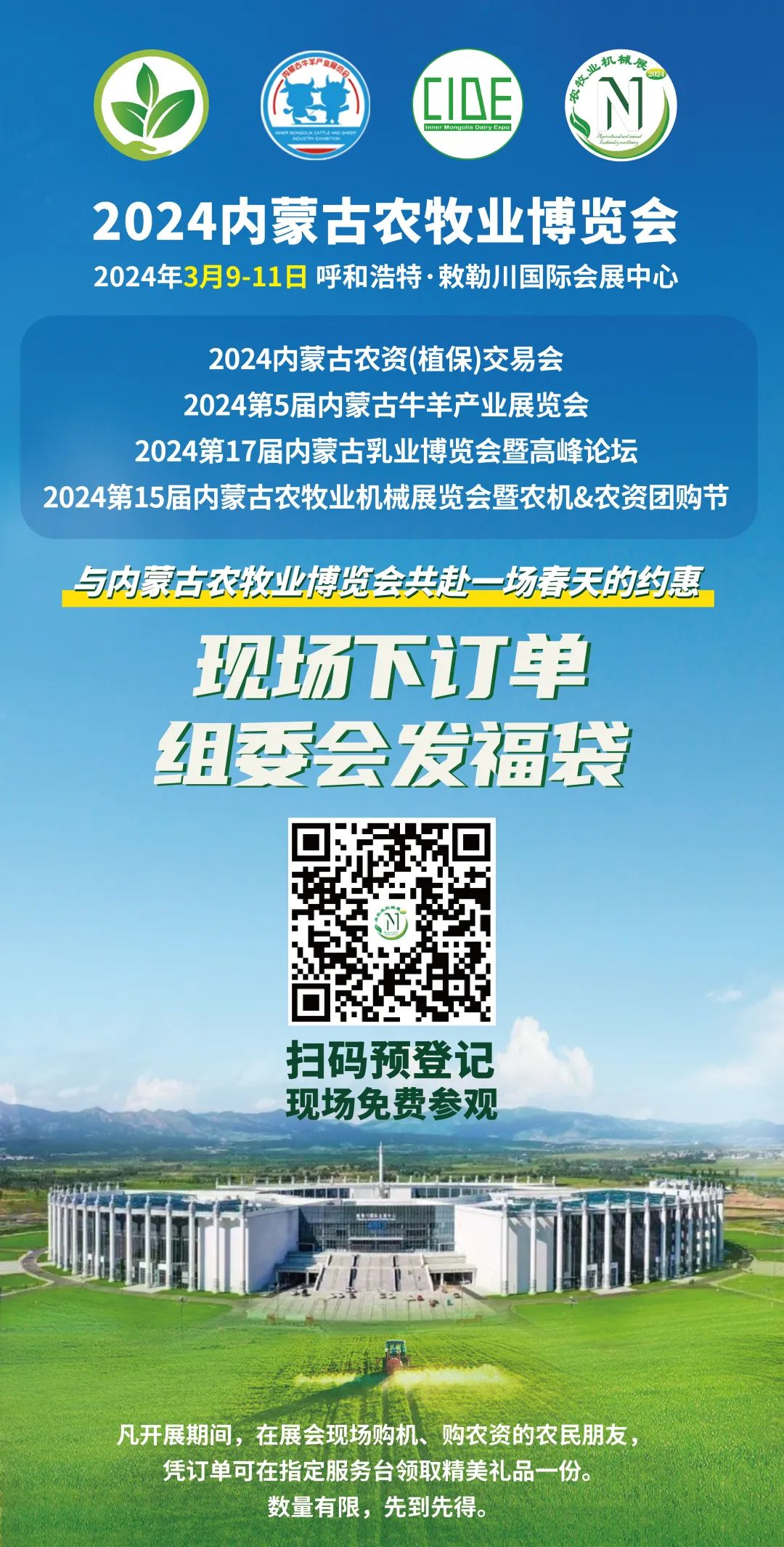 歡迎參會(huì)!更多展會(huì)資訊、請關(guān)注微信公眾號:內(nèi)蒙古農(nóng)機(jī)展。進(jìn)入展會(huì)須注冊登記方可入場,煩請?jiān)诠娞柌藛螜?/span>"參觀指南"-“參觀展會(huì)”按鈕點(diǎn)擊,隨后填寫信息進(jìn)行注冊,憑注冊成功的二維碼即可入場參觀。或掃描以下二維碼,進(jìn)行預(yù)登記。