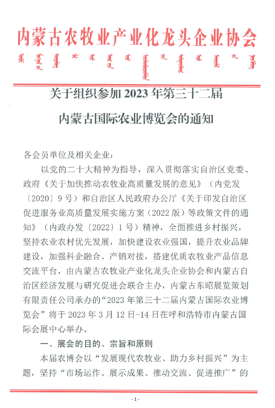 關(guān)于組織參加2023年第三十二屆內(nèi)蒙古國(guó)際農(nóng)業(yè)博覽會(huì)的通知