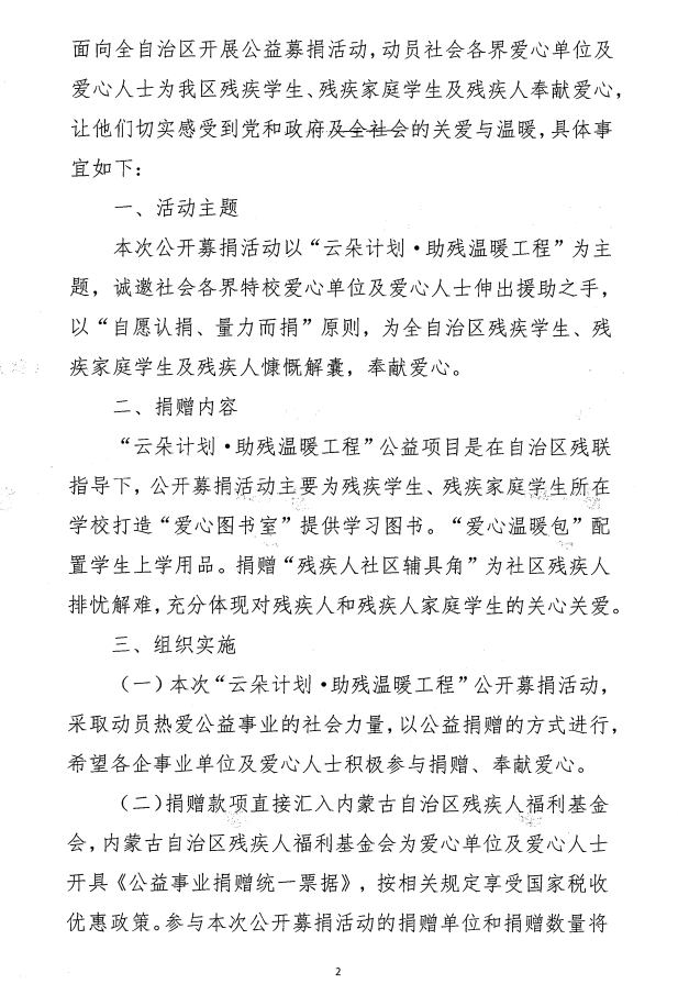 關(guān)于開展“云朵計劃·助殘溫暖工程’公益項目專項募捐的通知