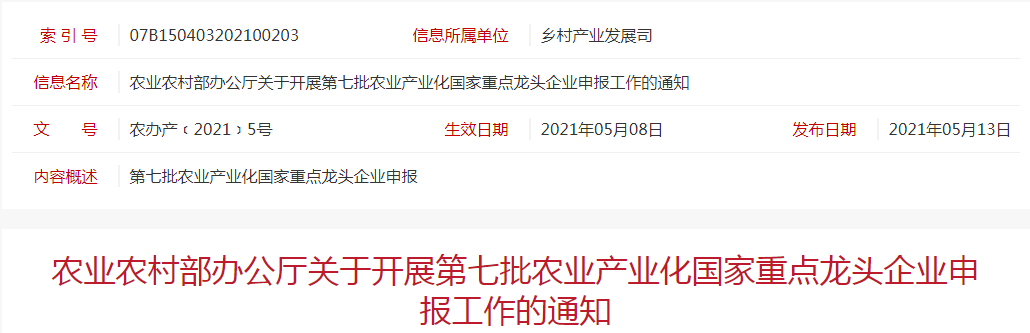 標(biāo)題:農(nóng)業(yè)農(nóng)村部辦公廳關(guān)于開展第七批農(nóng)業(yè)產(chǎn)業(yè)化國家重點龍頭企業(yè)申報工作的通知