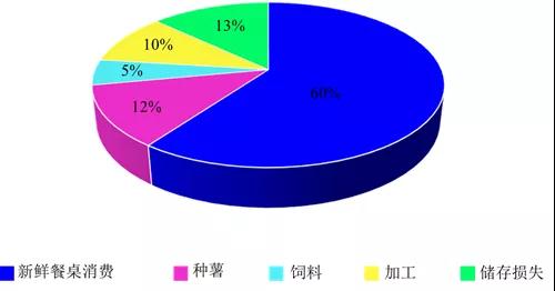 中國馬鈴薯總消費量基本穩(wěn)定,但預(yù)計未來十年將略有增長。業(yè)內(nèi)人士估計,中國60%的馬鈴薯是在家里或餐館用于鮮食消費。這與幾年前相比并沒有變化,因為馬鈴薯仍然是中國消費者的主食。中國馬鈴薯總量的約10%用于加工業(yè)消費,12%用于種薯消費,5%作為飼料消費,儲藏造成的損失約為13%。根據(jù)《中國農(nóng)業(yè)展望報告》預(yù)測,鮮食消費的馬鈴薯將年增長0.3%,加工消費的馬鈴薯將年增長1.3%,飼料消費將年增長0.5%,種薯消費和儲藏損失每年將分別增加1.1%(圖3)。